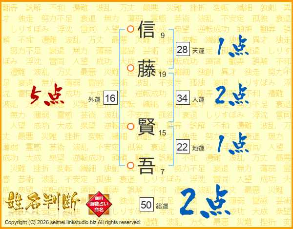 信(9画)藤(19画) 賢(15画)吾(7画)