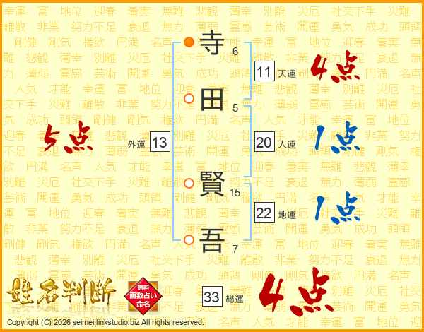 寺(6画)田(5画) 賢(15画)吾(7画)