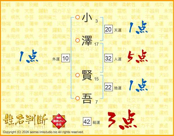 小(3画)澤(17画) 賢(15画)吾(7画)