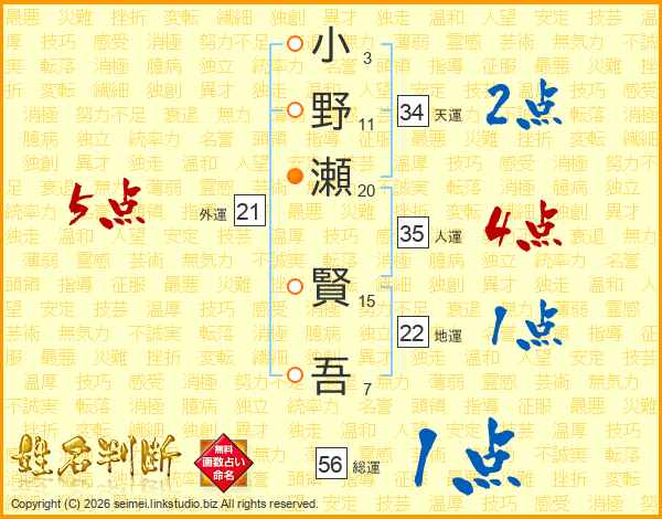 小(3画)野(11画)瀬(20画) 賢(15画)吾(7画)