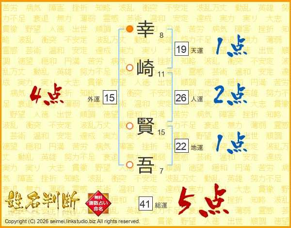 幸(8画)崎(11画) 賢(15画)吾(7画)