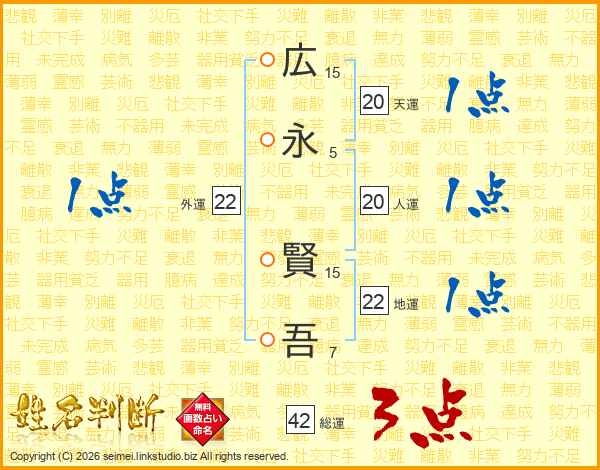 広(15画)永(5画) 賢(15画)吾(7画)