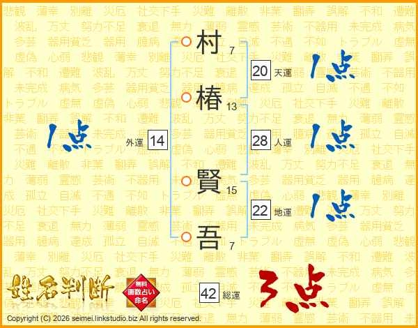 村(7画)椿(13画) 賢(15画)吾(7画)