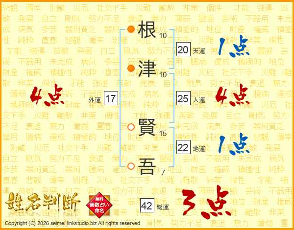 根(10画)津(10画) 賢(15画)吾(7画)