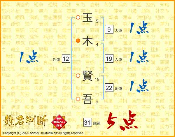 玉(5画)木(4画) 賢(15画)吾(7画)