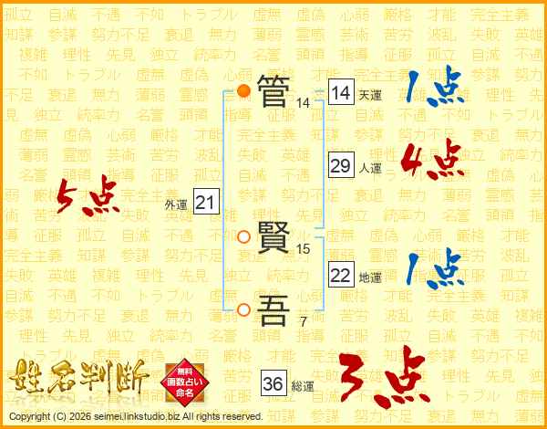 生活面を象徴する運勢です。外部から受ける影響力を表し、結婚運、家庭運や職場、環境への順応性を表します。総運から人運を引いた画数。姓や名が1文字の場合を除く。