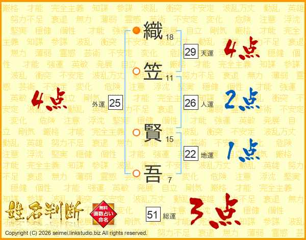 織(18画)笠(11画) 賢(15画)吾(7画)
