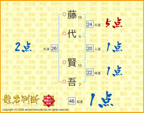 藤(19画)代(5画) 賢(15画)吾(7画)