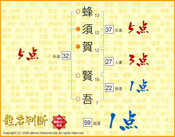 蜂(13画)須(12画)賀(12画) 賢(15画)吾(7画)