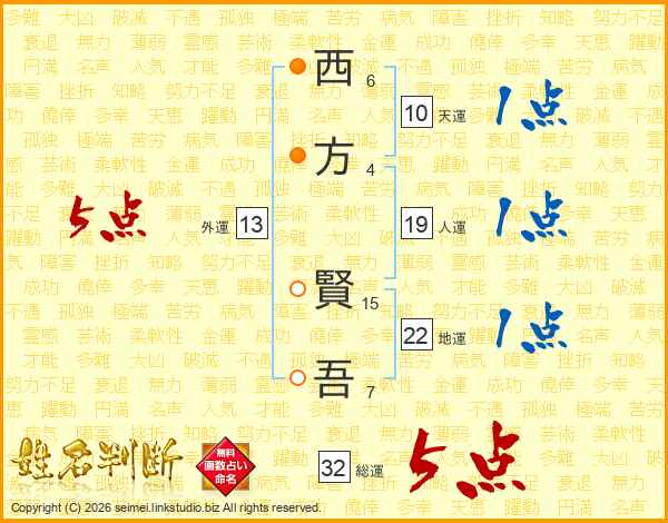 西(6画)方(4画) 賢(15画)吾(7画)