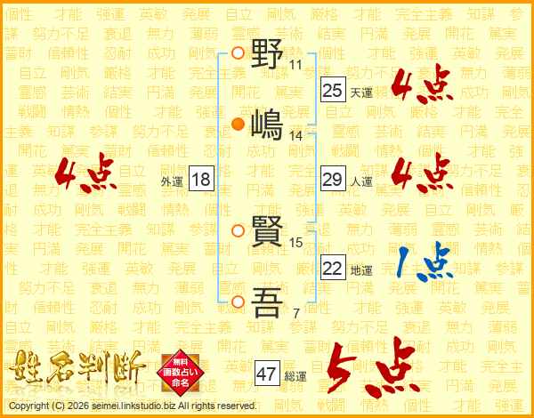 野(11画)嶋(14画) 賢(15画)吾(7画)