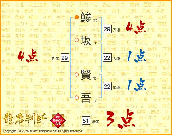 鯵(22画)坂(7画) 賢(15画)吾(7画)