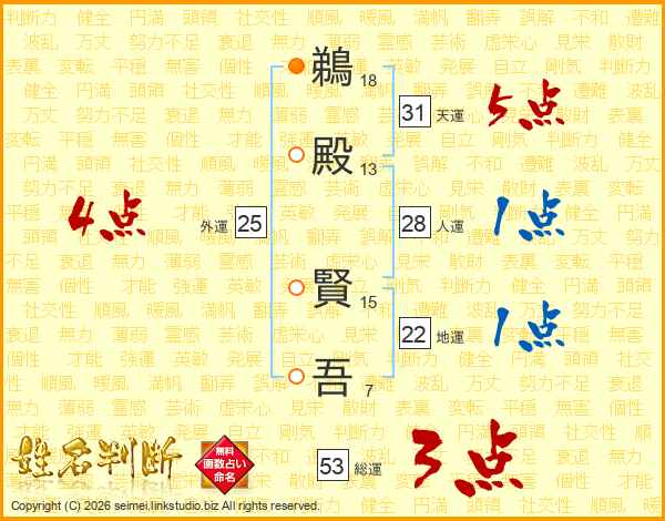 鵜(18画)殿(13画) 賢(15画)吾(7画)