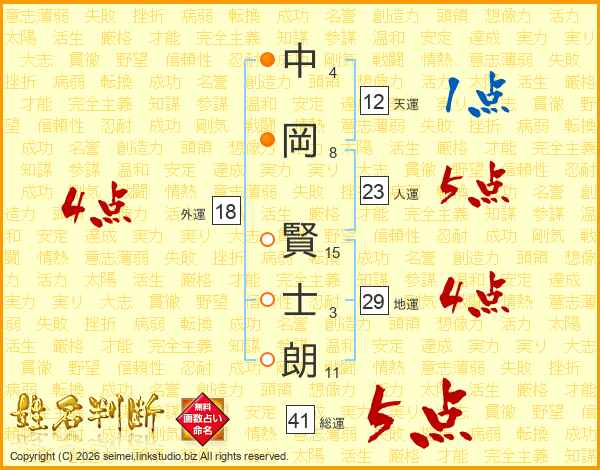 中(4画)岡(8画) 賢(15画)士(3画)朗(11画)