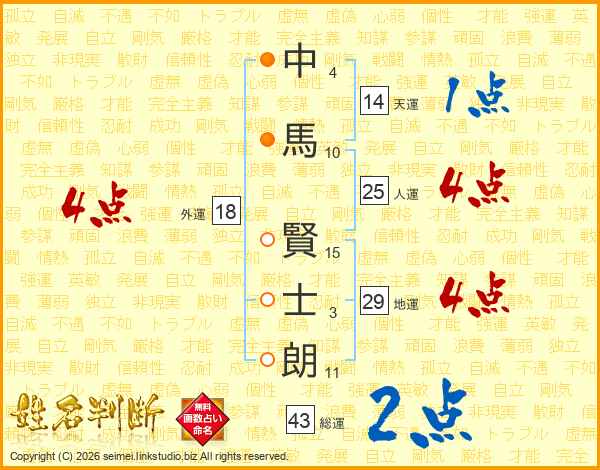 中(4画)馬(10画) 賢(15画)士(3画)朗(11画)