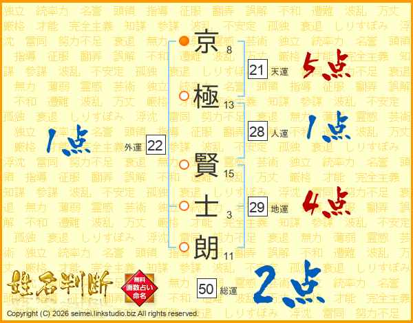 京(8画)極(13画) 賢(15画)士(3画)朗(11画)