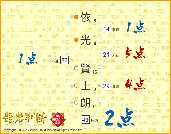 依(8画)光(6画) 賢(15画)士(3画)朗(11画)