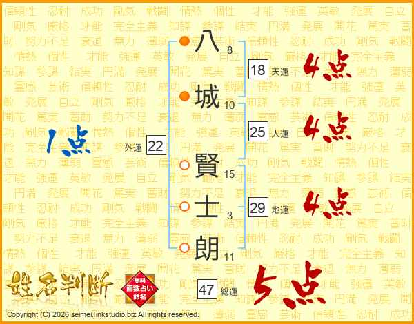 八(8画)城(10画) 賢(15画)士(3画)朗(11画)