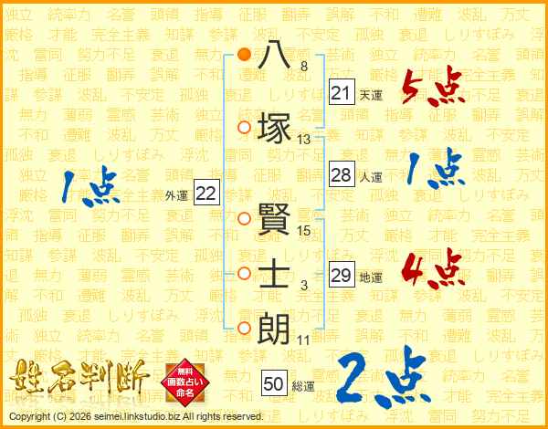 八(8画)塚(13画) 賢(15画)士(3画)朗(11画)