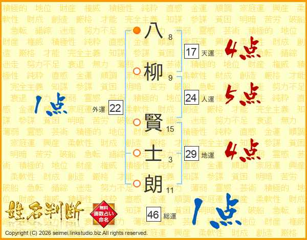 八(8画)柳(9画) 賢(15画)士(3画)朗(11画)