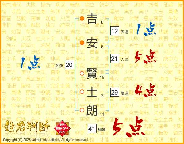 吉(6画)安(6画) 賢(15画)士(3画)朗(11画)