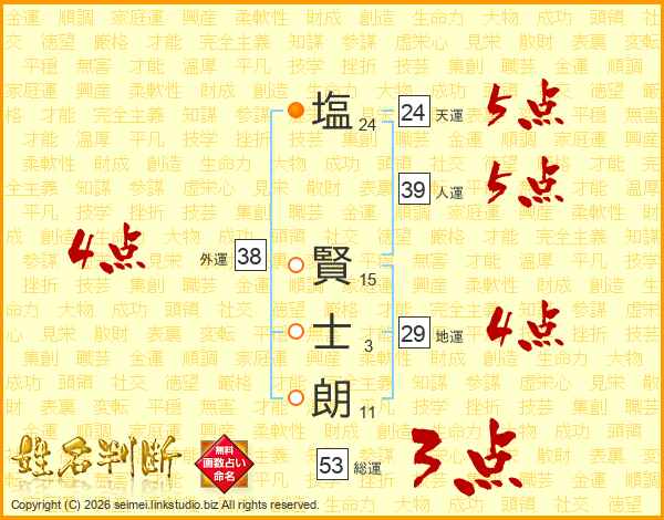 塩(24画) 賢(15画)士(3画)朗(11画)