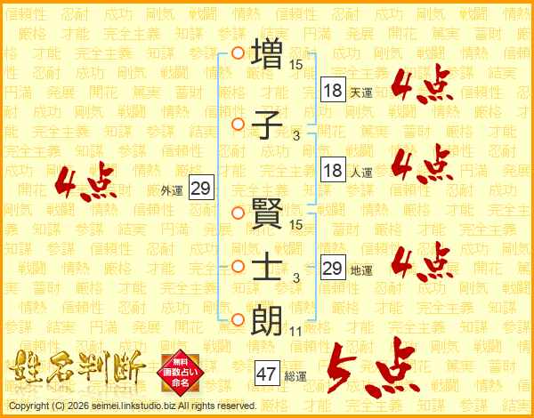 増(15画)子(3画) 賢(15画)士(3画)朗(11画)