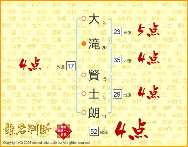 大(3画)滝(20画) 賢(15画)士(3画)朗(11画)