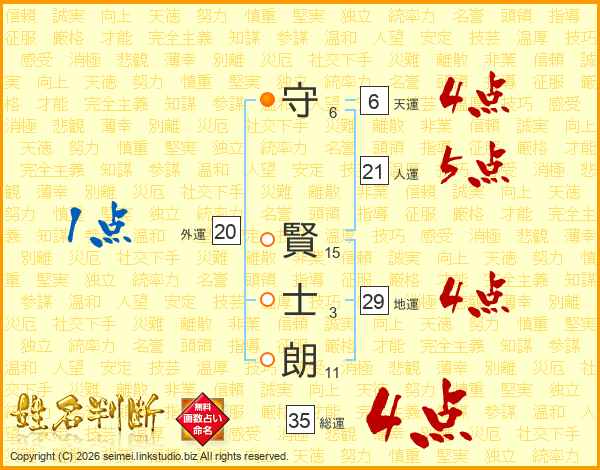 家系が持つ宿命的な運勢を表します。祖先から受け継いだ苗字ですので自分の力が及びません。家柄を象徴します。苗字の合計画数。