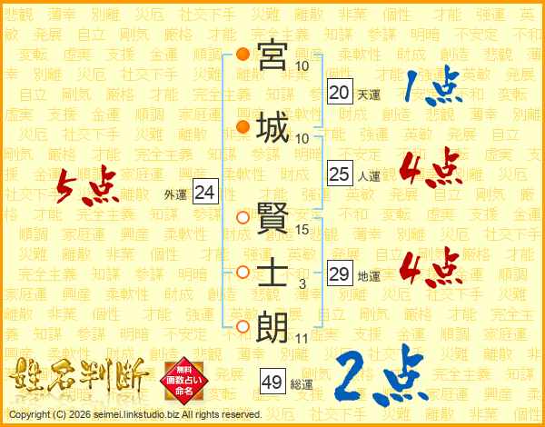 宮(10画)城(10画) 賢(15画)士(3画)朗(11画)