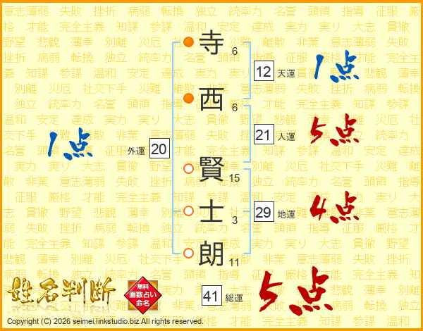 寺(6画)西(6画) 賢(15画)士(3画)朗(11画)
