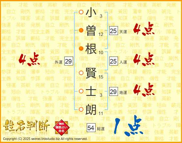 小(3画)曽(12画)根(10画) 賢(15画)士(3画)朗(11画)