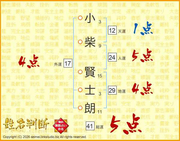 小(3画)柴(9画) 賢(15画)士(3画)朗(11画)