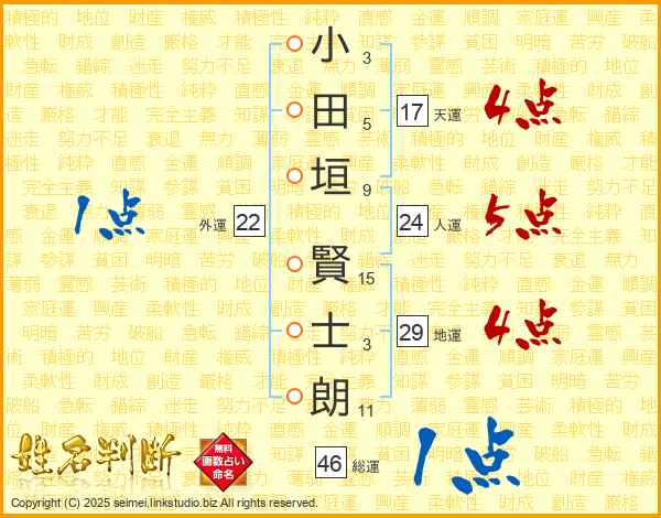 小(3画)田(5画)垣(9画) 賢(15画)士(3画)朗(11画)