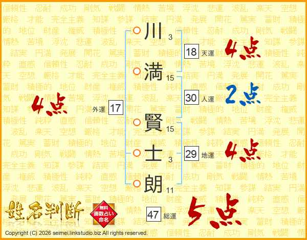 川(3画)満(15画) 賢(15画)士(3画)朗(11画)