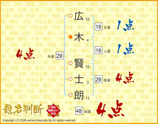 広(15画)木(4画) 賢(15画)士(3画)朗(11画)