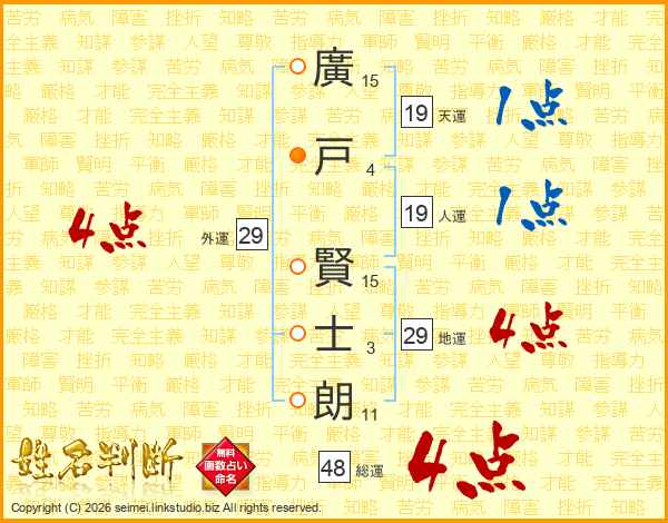 廣(15画)戸(4画) 賢(15画)士(3画)朗(11画)
