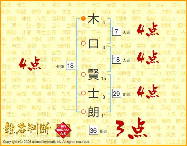 木(4画)口(3画) 賢(15画)士(3画)朗(11画)