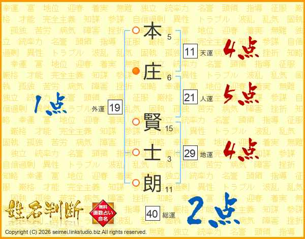 本(5画)庄(6画) 賢(15画)士(3画)朗(11画)