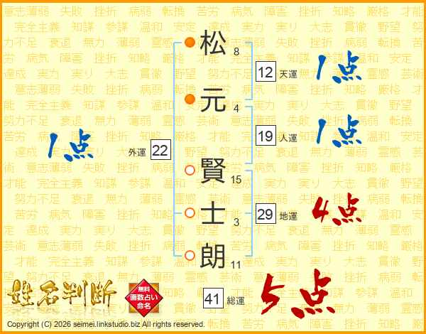 松(8画)元(4画) 賢(15画)士(3画)朗(11画)
