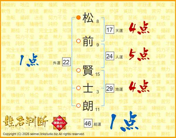 松(8画)前(9画) 賢(15画)士(3画)朗(11画)