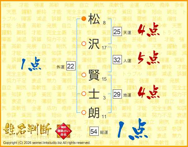 松(8画)沢(17画) 賢(15画)士(3画)朗(11画)