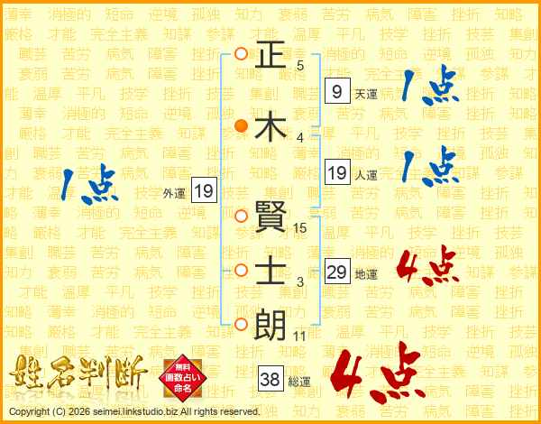 正(5画)木(4画) 賢(15画)士(3画)朗(11画)