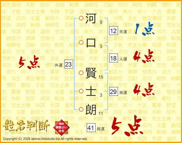 河(9画)口(3画) 賢(15画)士(3画)朗(11画)