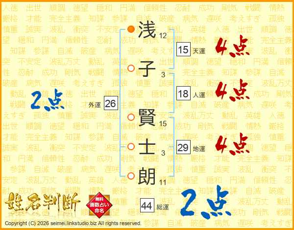 浅(12画)子(3画) 賢(15画)士(3画)朗(11画)
