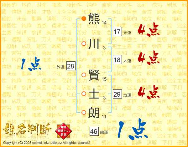 熊(14画)川(3画) 賢(15画)士(3画)朗(11画)