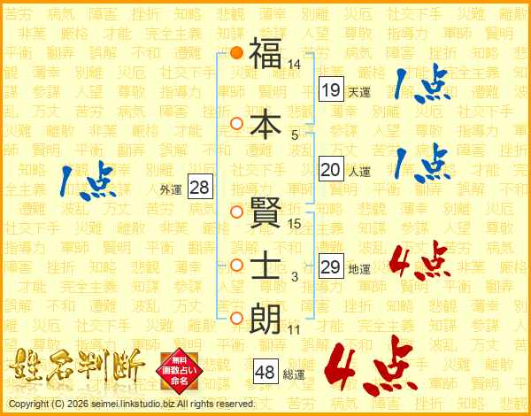 福(14画)本(5画) 賢(15画)士(3画)朗(11画)