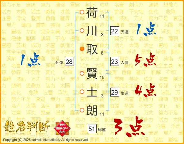 荷(11画)川(3画)取(8画) 賢(15画)士(3画)朗(11画)