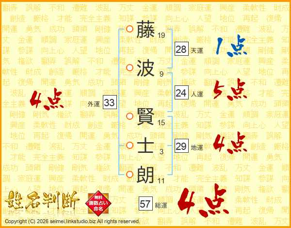 藤(19画)波(9画) 賢(15画)士(3画)朗(11画)