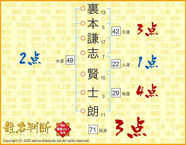 裏(13画)本(5画)謙(17画)志(7画) 賢(15画)士(3画)朗(11画)